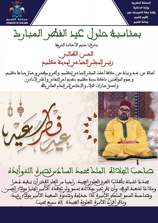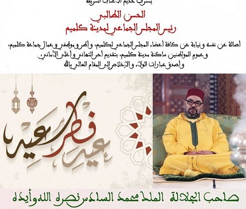 وبهذه المناسبة، يتقدم السيد “الحسن الطالبي” رجل الأعمال و رئيس جماعة كليميم و عضو غرفة التجارة و الصناعة و الخدمات بجهة كليميم واد نون، أصالة عن نفسه ونيابة عن جميع أعضاء الجماعة وموظفات وموظفيها، و عموم المواطنين من ساكنة المدينة، إلى صاحب الجلالة الملك محمد السادس، وإلى جميع أفراد الأسرة الملكية، بتهانيه بمناسبة عيد الفطر.