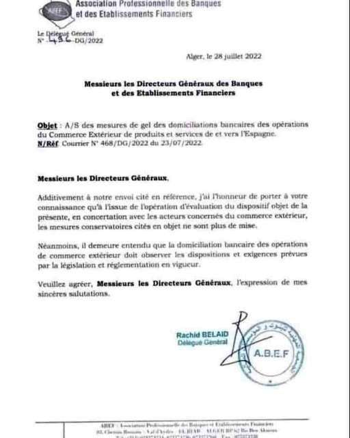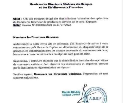 أمس جناح في جمهورية البَنَانْ يلغي قرار تجميد العلاقات التجارية عبر نفس جمعية البنوك التي اتخذت القرار في يونيو بسبب تأثر تجارة كبار المسؤولين والجنرالات مع اسبانيا وممتلكاتهم فيها.