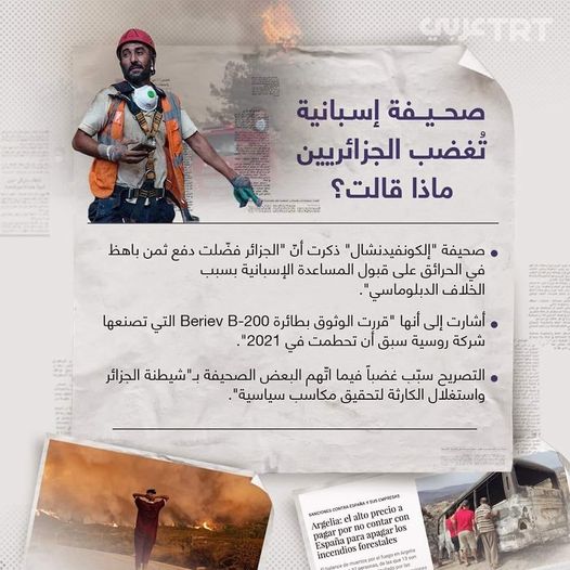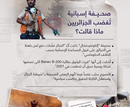 الكونفيدينسيال: الجزائر فَضْلاَتْ دفع ثمن باهظ من الأرواح والخسائر بَاشْ مَتَسْتَاعْنْ بإسبانيا لإطفاء الحرائق. حْنَا راسْنا خْشِين يَا خُو.. ولِّي تْفَرْمَى يَبقى تَمَّا ولِّي تْهَرَّسْ هَا لَكْرَارْسْ ولِّي مَاتْ نْحَسبوه على شوهادا الثَّورة والخبز والما!