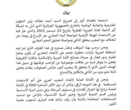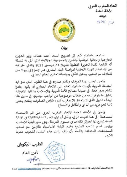 اتحاد المغرب العربي يرد على احمد عطاف وزير الخارجية الجزائري، ويقول له عليك ربط الكلام بالفعل وبداية ذلك على الجزائر دفع ما بذمتها للاتحاد وتعيين موظفيها الذين سحبتهم منذ سنوات ولم تعوضهم..