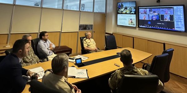 دار وزير الدفاع الأرجنتيتي، لويس بيتري، مرفوق بالقيادات فالجيش الأرجنتيني، إجتماع عبر تقنية الفيديو مع الضباط العسكريين الأرجنتينيين اللي خدامين فبعثات السلام فالعالم.