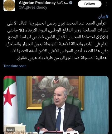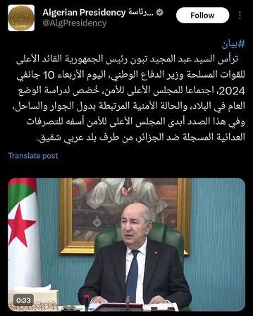 صدرات الرئاسة الجزايرية بيان من بعد انعقاد اجتماع المجلس الأعلى للأمن، برئاسة عبد المجيد تبون وحضور قيادات العسكر وأعضاء فالحكومة الجزائرية.