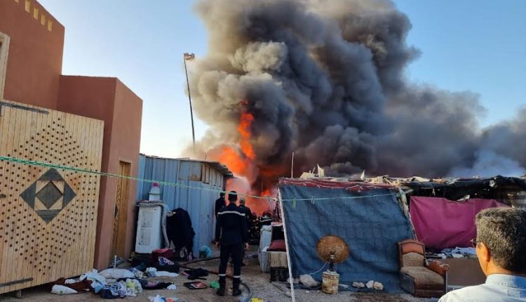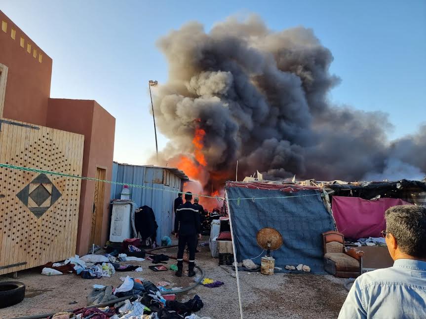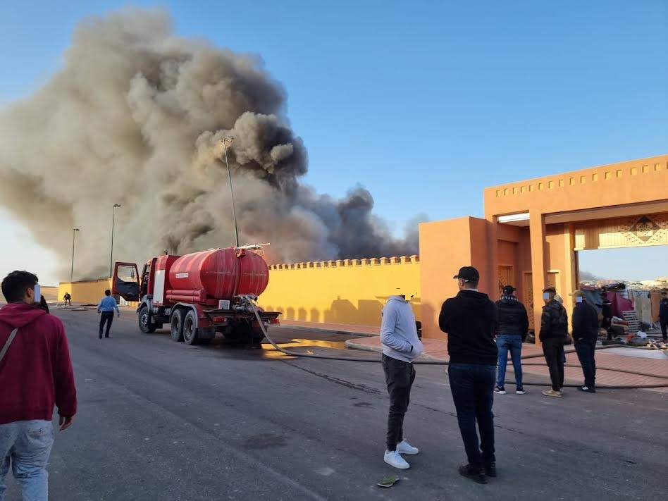 اندلع زوال اليوم الأحد 21 يناير الجاري حريق مهول بسوق المتلاشيات قرب السوق النموذجي الحزام بمدينة العيون.