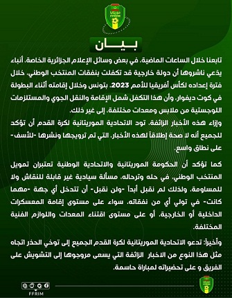 وكانت الاتحادية الموريتانية لكرة القدم قالت فبيان ليها: “تابعنا خلال الساعات الماضية، في بعض وسائل الإعلام الجزائرية الخاصة، أنباء يدعي ناشروها أن دولة خارجية تكفلت بنفقات المنتخب الوطني، خلال فترة إعداده لكأس إفريقيا للأمم 2023، بتونس، وخلال إقامته أثناء البطولة في كوت ديفوار، وأن هذا التكفل شمل الإقامة والنقل الجوي والمستلزمات اللوجستية من ملابس ومعدات مختلفة، إلى غير ذلك. وإزاء هذه الأخبار الزائفة، تود الاتحادية الموريتانية لكرة القدم أن تؤكد للجميع أنه لا صحة إطلاقاً لهذه الأخبار، التي تم ترويجها ونشرها – للأسف – على نطاق واسع”.