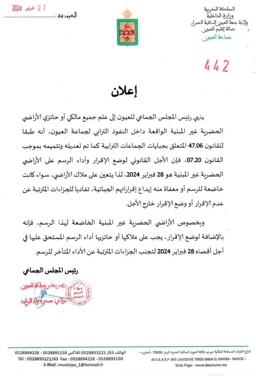 رَدُّو البال..هَا الإعلان لِّي صْدْرُو ولد الرشيد وُ كَيْهَمْ بزَّافْ ساكنة لعيون..مستجدات إدارة الموقع نشر في 7 فبراير 2024 الساعة 22 و 30 دقيقة الصحراء اليومية/العيونمشاركة بفايسبوكFacebookFacebookمشاركة بتويترTwitterTwitter مشاركة بواتسابWhatsAppWhatsApp Share to ارسال ايميلEmailEmail مشاركة بلينكدانLinkedInLinkedInمشاركة بمسنجرMessengerMessenger طباعةPrintطباعة رابط المشاركة : حمدي ولد الرشيدمدينة العيون