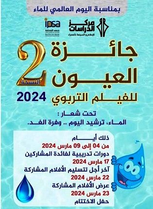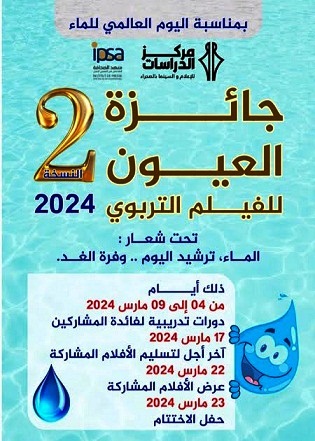 بشراكة مع معهد الصحافة المتخصص في السمعي البصري بالعيون، ينظم مركز الدراسات للإعلام والسينما بالصحراء بمناسبة اليوم العالمي للماء الذي يصادف 22 من شهر مارس، الدورة الثانية لجائزة الفيلم التربوي القصير تحت شعار “الماء، ترشيد اليوم .. وفرة الغد “.