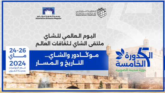 تماشيا مع التعليمات المولوية السامية الحاثة على إيلاء الثقافة بمفهومها الحضاري/الإنساني المكانة اللائقة بها، من أجل تمكين الأقاليم الجنوبية من مشروع ثقافي هادف يجسد التنوع والتفاعل بين الثقافات والروافد المغـربية المتعددة في إرتباطها القاري و الدولي … وحرصا على تنزيل برامجها النوعية الجادة وإحتفالا “باليوم الدولي للشاي” والذي كانت ” جمعية مدينتي ” سباقة في تنظيمه بمدينة العيون وبالمملكة المغربية، عبر رؤية شمولية تعنى بالصناعة الثقافية خدمة لأهداف التنمية الترابية المندمجة … ومن خلال البحث التاريخي الأكاديمي المعمق عن أوراق ” نبات كاميليا سينيسيس” المعروف “بالشاي” و تتبع حياة هذا المشروب السحري … في بعده التاريخي،الإقتصادي المادي واللامادي … تنظم جمعية مدينتي بتعاون مع جمعية الصويرة موكادور … الدورة الخامسة لملتقى الشاي لثقافات العالم، تحت شعار “موكادور والشاي: التاريخ والمسار … من 24 إلى 26 ماي 2024” بقصر المؤتمرات بالعيون، بحيث سيعرف هذا النشاط الثقافي تكريم بعض الأسماء الوازنة على المستوى الوطني والدولي بالإضافة إلى شخصيات أخرى تنتمي لعالم الثقافة والفكر … كما سيتخلل برنامج هاته الدورة ندوات فكرية، وأنشطة موازية … للتذكير بأحد الحقب المهمة في التاريخ الإنساني العالمي عامة والمغربي الإفريقي خاصة عبر إبراز المكانة الهامة “لميناء موكادور في تجارة الشاي خلال القرن18 ” .