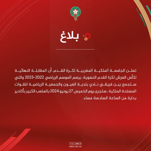 أعلنت الجامعة الملكية المغربية لكرة القدم في بيان رسمي عن تفاصيل المباراة النهائية لكأس العرش لكرة القدم النسوية للموسم الرياضي 2022-2023. وستجمع المباراة بين فريق نادي بلدية العيون وفريق الجمعية الرياضية للقوات المسلحة الملكية. وتم تحديد يوم الخميس 27 يونيو 2024 موعداً لهذه المواجهة، التي ستقام في الملعب الكبير بمدينة أكادير ابتداءً ابتداء من الساعة 6 مساء.