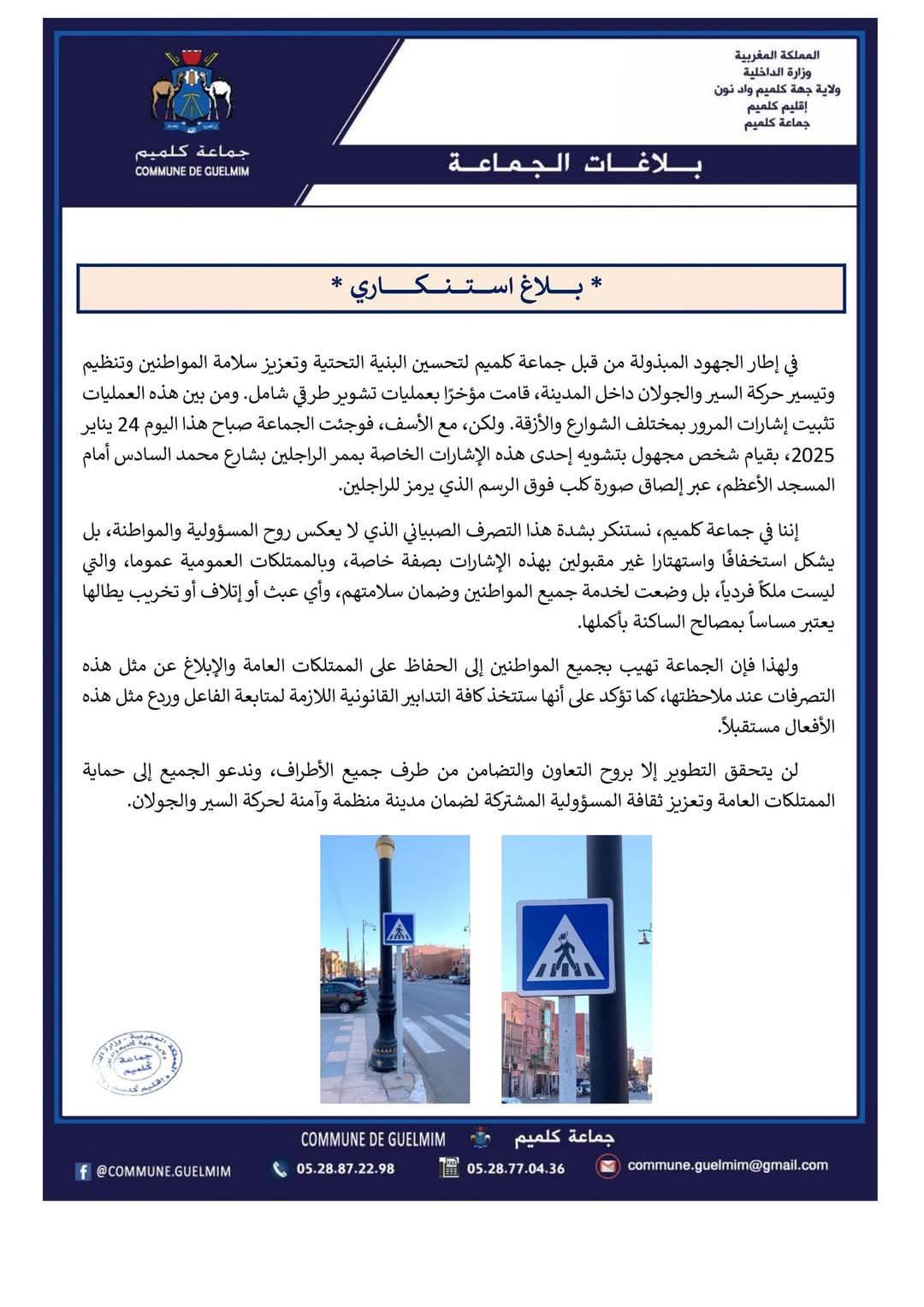 مجهول تَعَمَّدَ تشويه إحدى علامات التشوير بكلميم و المجلس الجماعي للمدينة يستنكر..جرائم وحوادث إدارة الموقع نشر في 24 يناير 2025 الساعة 23 و 57 دقيقة الصحراء اليومية/كليميممشاركة بفايسبوكFacebookFacebookمشاركة بتويترTwitterTwitter مشاركة بواتسابWhatsAppWhatsApp Share to ارسال ايميلEmailEmail مشاركة بلينكدانLinkedInLinkedInمشاركة بمسنجرMessengerMessenger طباعةPrintطباعة رابط المشاركة : كلميم