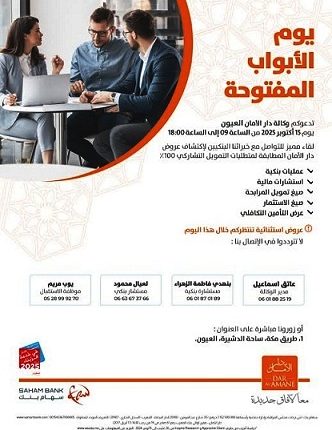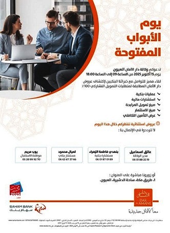 بمناسبة يوم الأبواب المفتوحة، تنظم وكالة دار الأمان العيون يوم الأربعاء 15 أكتوبر 2025 لقاءا مميزا للتواصل مع خبرائها البنكيين، لاكتشاف عروض دار الأمان المتطابقة لمتطلبات التمويل التشاركي 100%