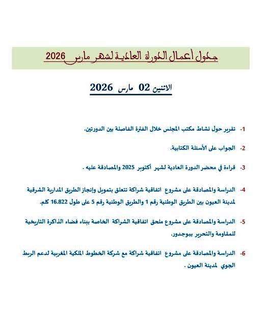 هَا جدول أعمال الدورة العادية لشهر مارس لِّي غادِي إناقْشْ صْبَاحْ مجلس جهة لعيون…مستجدات إدارة الموقع نشر في 1 مارس 2026 الساعة 15 و 57 دقيقة ????????????????????????????????????الصحراء اليومية/العيون مشاركة بفايسبوكFacebookFacebookمشاركة بتويترTwitterTwitter مشاركة بواتسابWhatsAppWhatsApp Share to ارسال ايميلEmailEmail مشاركة بلينكدانLinkedInLinkedInمشاركة بمسنجرMessengerMessenger طباعةPrintطباعة رابط المشاركة : جهة العيون
