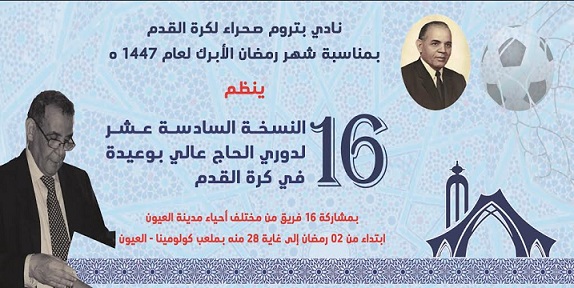 بمناسبة شهر رمضان الأبرك لعام 1447 هجرية الموافق 2026 ميلادية، و سيرا كعادته، نادي بتروم صحراء بالعيون، ينظم دوري الحاج “عالي بوعيدة” بمشاركة 16 فريقا من مختلف أحياء مدينة العيون ابتداء من 02 رمضان إلى غاية 28 منه و هو يوم اجراء المقابلة النهائية.