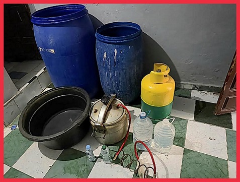 وقد أمكن توقيف المشتبه فيه بحي الوحدة بمدينة العيون قبل أن تسفر عملية التفتيش التي بوشرت بمنزله الكائن بنفس الحي، عن حجز ما مجموعه 360 لترا ونصف من صافي ومخمر ماء الحياة، علاوة على معدات معمل تقليدي خاص بتقطير المسكر وبرميلين كبيري الحجم.