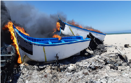 وباشرت عناصر الدرك الملكي عملية إتلاف القارب التقليدي الصنع حرقا، وكذا تحقيقاتها للإلمام بحيثيات الواقعة والإحاطة بمدبري عملية الهجرة السرية التي كان يُحضر لها قصد إيقافهم وعرضهم على العدالة.