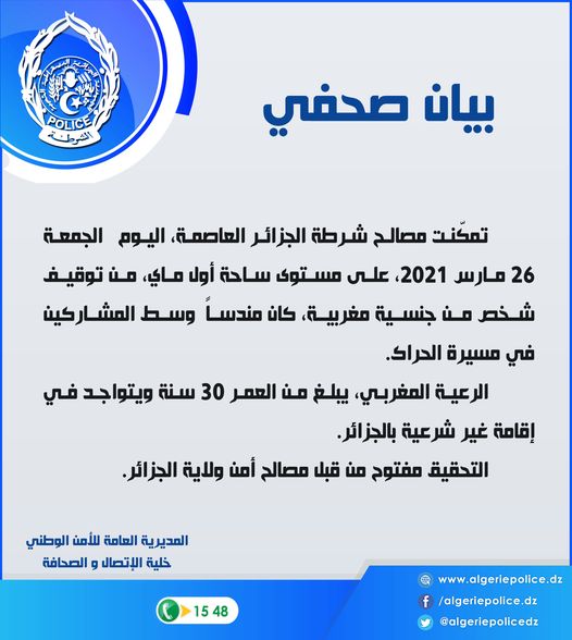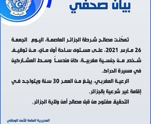 أعلن بيان للمديرية العامة للأمن الوطني بالجزائر أن مصالح شرطة الجزائر العاصمة تمكنت اليوم الجمعة على مستوى ساحة أول ماي من توقيف شخص من جنسية مغربية كان مندسا وسط المشاركين في مسيرة الحراك.