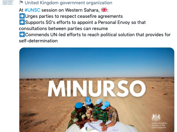 ولم تتأخر البعثة البريطانية لدى الأمم المتحدة في العودة عن التغريدة وهاد الموقف الضبابي، حيث عمدت دقائق بعد نشر التغريدة على حذفها من الحساب الرسمي، في إشارة لعدم قناعتها بمضمونها بناء على العلاقات القوية التي تجمعها بالمملكة المغربية، والموقف الحيادي الذي دأبت على إستلهامه بخصوص النزاع، ذلك القائم على دعم مساعي الأمم المتحدة، دون الاعتماد على بروباكَاندا “الحرب الوهمية” التي تروج لها البوليساريو والجزائر منذ تاريخ 13 نونبر الماضي لدى تحرير القوات المسلحة الملكية المغربية لمعبر الگرگرات.