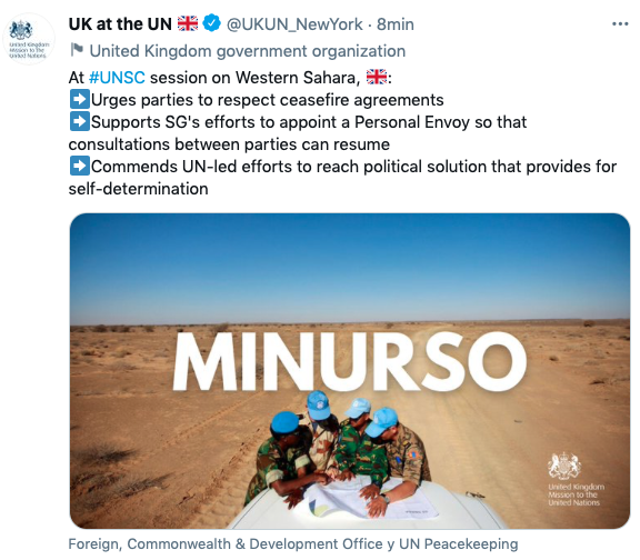 وعقبت البعثة البريطانية على حسابها في منصة التواصل الاجتماعي “تويتر” على الجلسة بدعوة “الأطراف لاحترام إتفاق وقف إطلاق النار”، والإعراب عن دعمها لـ “جهود الأمين العام للأمم المتحدة لتعيين مبعوث شخصي حتى يمكن استئناف المشاورات بين الأطراف، فضلا عن دعم “الجهود التي تقودها الأمم المتحدة للتوصل إلى حل سياسي يوفر تقرير المصير”، وفقا للتغريدة.