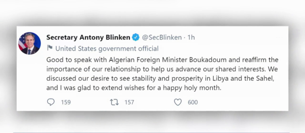 في تغريدة له على موقع تويتر، كذب وزير الخارجية الأمريكي أنطوني بلينكن، ما ذكره وزير الخارجية الجزائري صبري بوقادوم، والذي أعلن في تدوينة له عبر حسابه على تويتر أنه تباحث هاتفيا مع نظيره الأمريكي بشأن عدة ملفات منها قضية الصحراء.