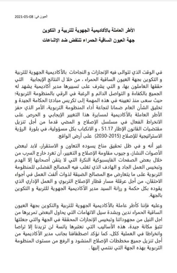 أطر أكاديمية التعليم بجهة العيون الساقية الحمراء يفندون كل الشائعات…مجتمع إدارة الموقع نشر في 10 مايو 2021 الساعة 12 و 39 دقيقة الصحراء اليومية/ العيون مشاركة بفايسبوكFacebookFacebookمشاركة بتويترTwitterTwitter مشاركة بواتسابWhatsAppWhatsApp Share to ارسال ايميلEmailEmail مشاركة بلينكدانLinkedInLinkedInمشاركة بمسنجرMessengerMessenger طباعةPrintطباعة رابط المشاركة :