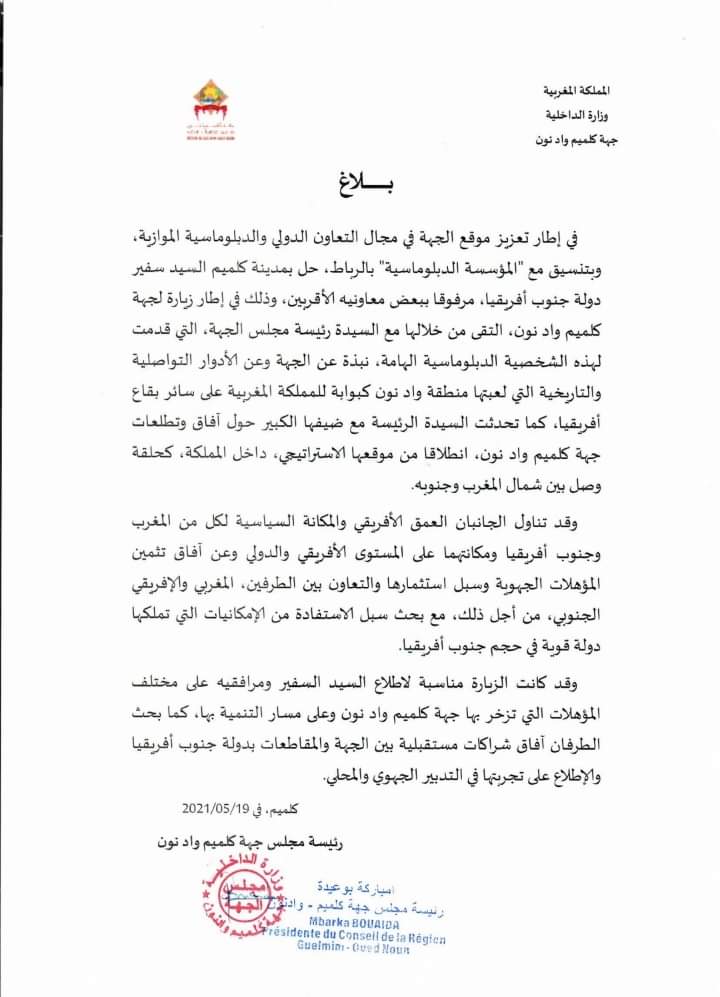 وفد دبلوماسي ترأسه سفير جنوب افريقيا زار جهة كليميم وادنون…(بلاغ)مجتمع إدارة الموقع نشر في 19 مايو 2021 الساعة 11 و 58 دقيقة الصحراء اليومية/ حميد بوفوس مشاركة بفايسبوكFacebookFacebookمشاركة بتويترTwitterTwitter مشاركة بواتسابWhatsAppWhatsApp Share to ارسال ايميلEmailEmail مشاركة بلينكدانLinkedInLinkedInمشاركة بمسنجرMessengerMessenger طباعةPrintطباعة رابط المشاركة :