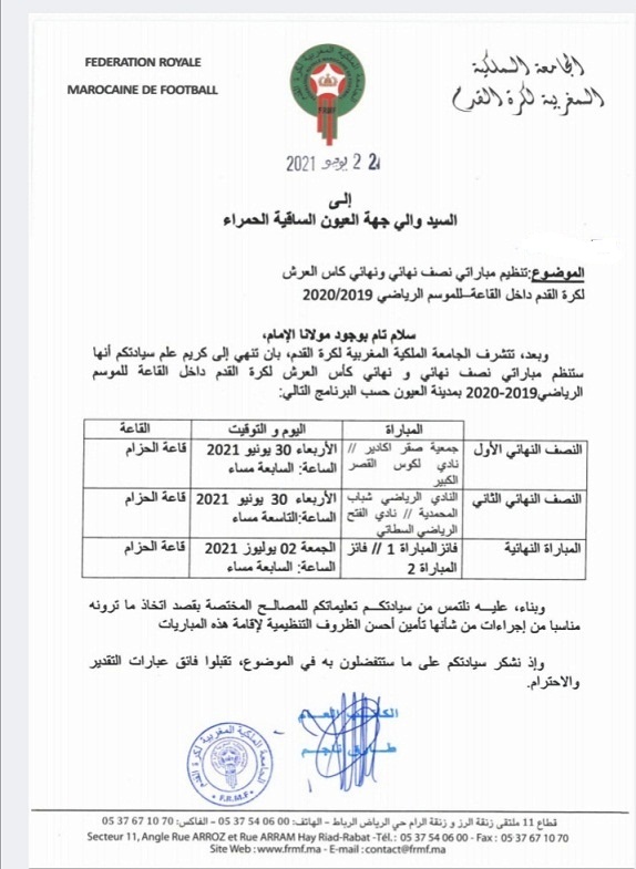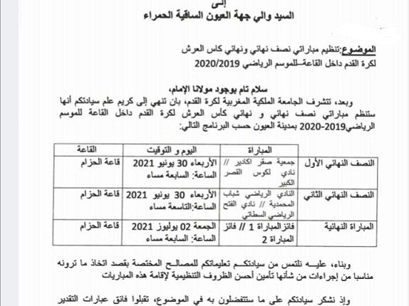 أعلنت الجامعة الملكية المغربية لكرة القدم أن القاعة المغطاة الحزام بالعيون، ستحتضن يوم 30 يونيو ويوم 2 يوليوز مبارتي نصف نهائي ونهائي كأس العرش لكرة القدم داخل القاعة للموسم الرياضي 2019.2020.