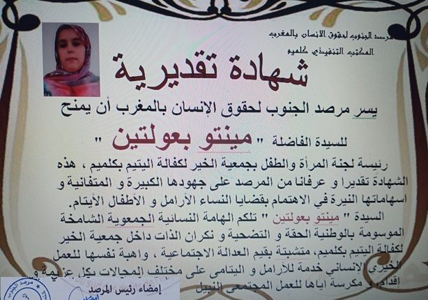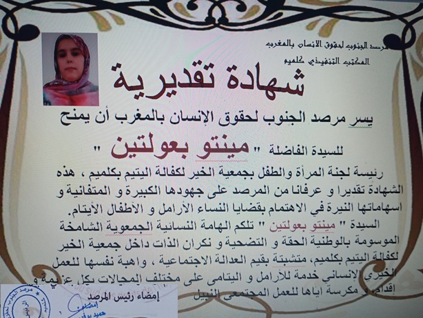 كرم مرصد الجنوب لحقوق الإنسان بالمغرب سفيرة الأعمال الخيرية التطوعية السيدة ” مينتو بعولتين ” رئيسة لجنة المرأة و الطفل بجمعية الخير لكفالة اليتيم بكليميم، وذلك بمنحها شهادة تقديرية اعترافا للمجهودات القيمة التي تقوم بها وتشريفها لجهة كليميم وادنون.
