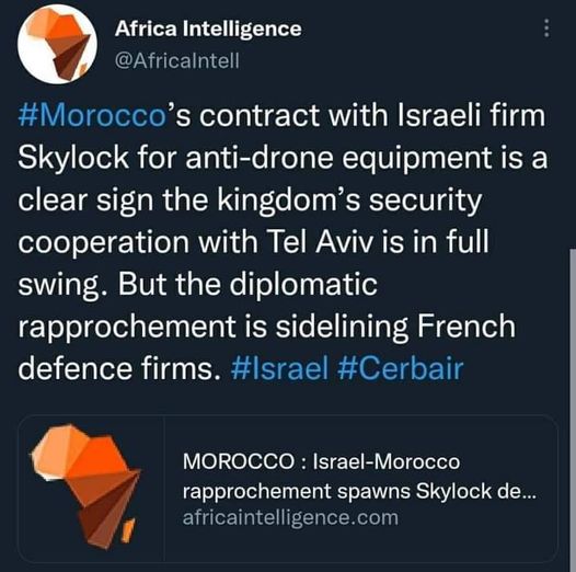 و قالت نفس الصحيفة أن الرباط منحت عقدًا لشركة إسرائيلية لتزويد الجيش المغربي بمعدات مضادة للطائرات بدون طيار في إشارة واضحة إلى أن التعاون الأمني للمملكة مع تل أبيب يسير على قدم وساق، لكن إعادة التنظيم الدبلوماسي الذي بات ينهجه المغرب حرم صناعة الدفاع الفرنسية من حصتها في السوق المغربية ..”